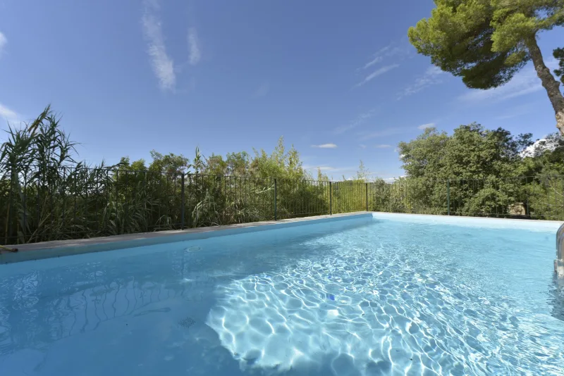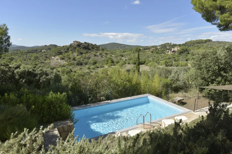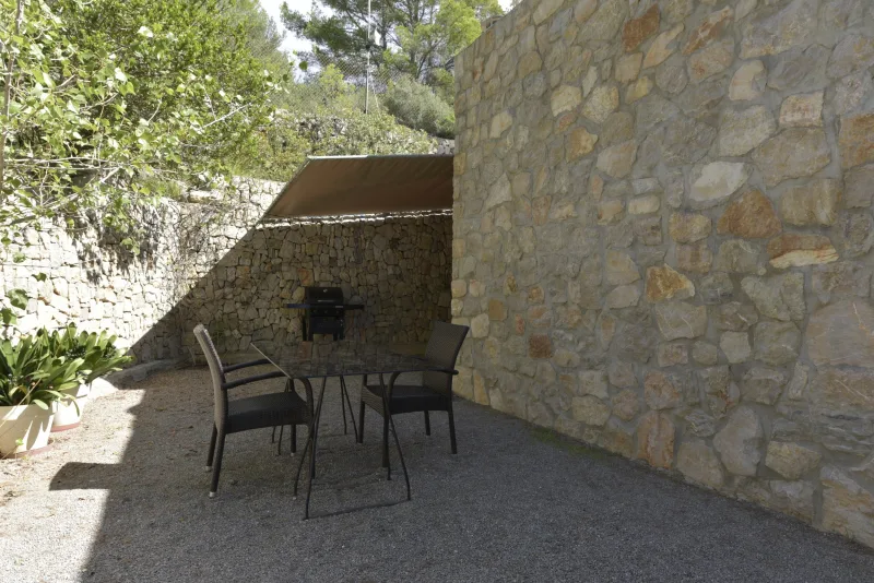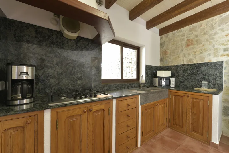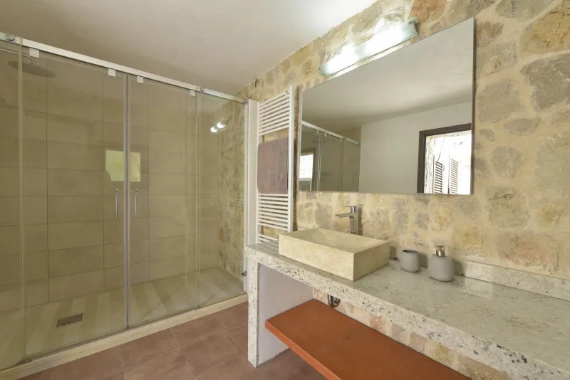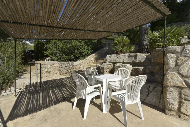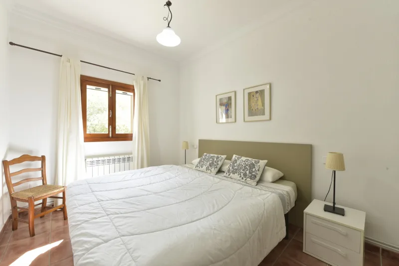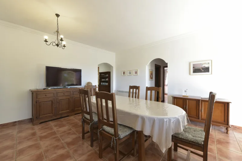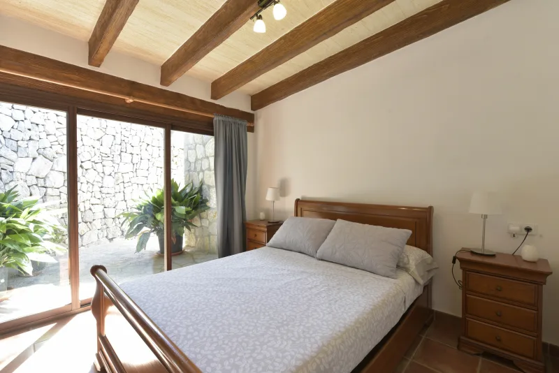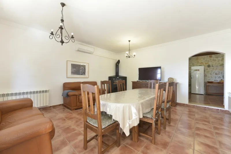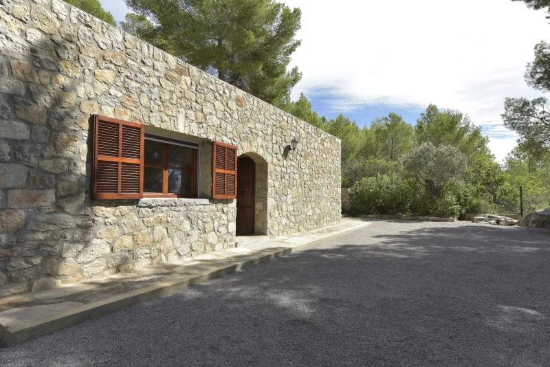 La casa de 150 m2 preside la finca desde su punto más alto, y consta de 3 dormitorios dobles;2 cuartos de baño; concina de concepto abierto; amplio salón comedor; despensa y coladuria. Cabe destacar sus cuidados exteriores, que han sido construidos con mucho cariño, piedra a piedra, por el propietario. Precisamente ahí, rodeada de verde, se encuentra la piscina azul intenso.