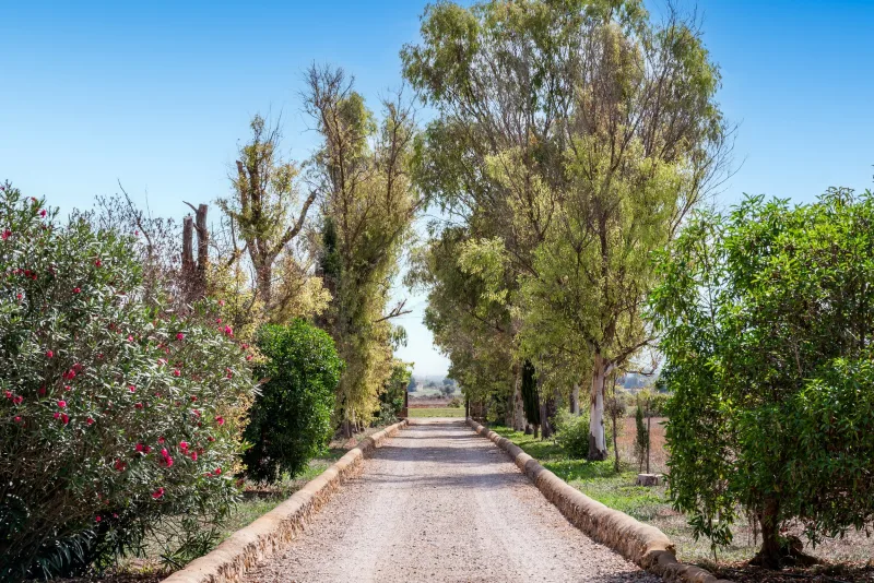 El camino que da acceso a la finca es de buena accesibilidad y se accede a la misma a través de un elegante pasaje hacia las casas.